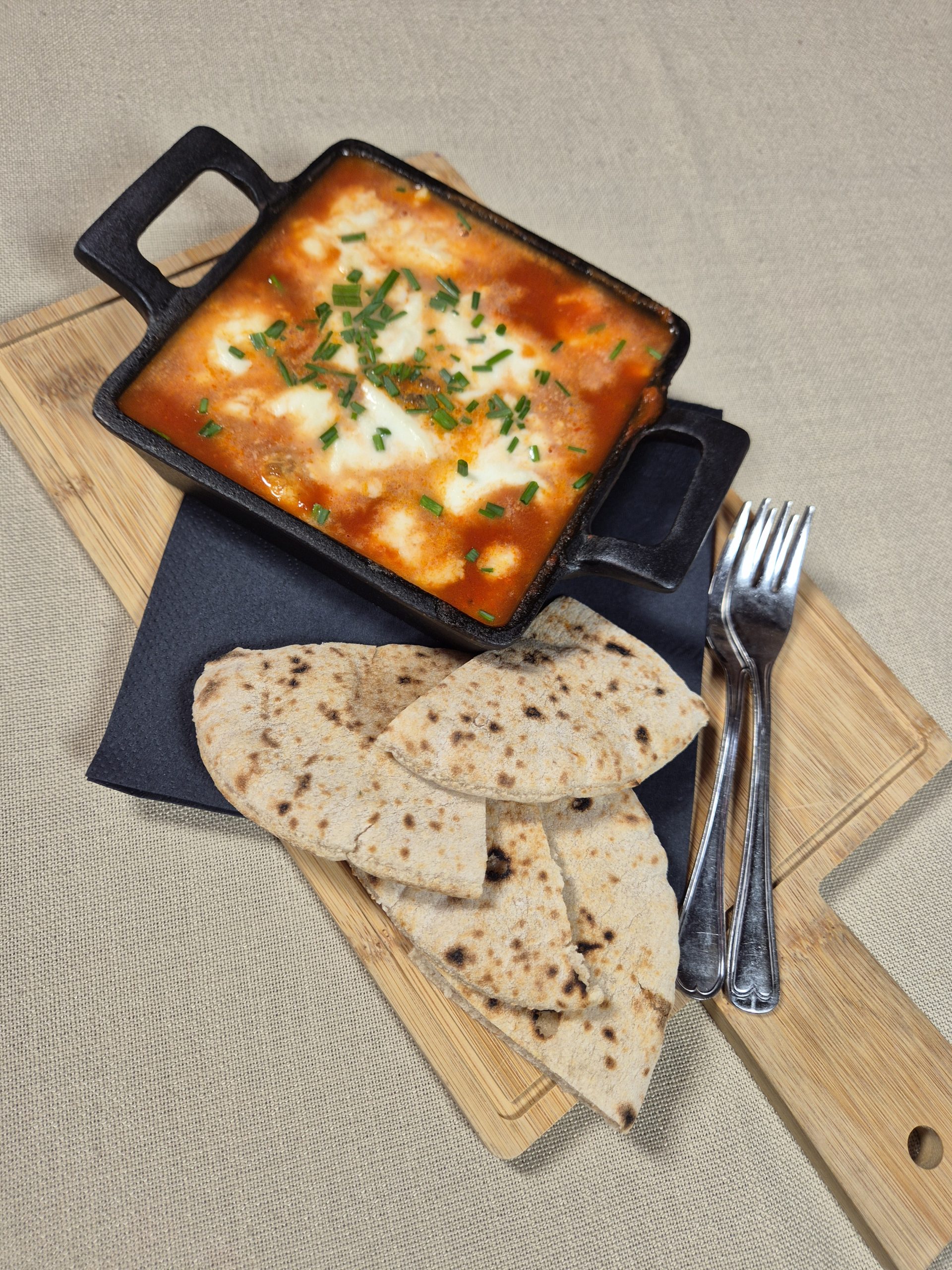 Een pannetje met pizzasaus, groenten, gegratineerd met kaas. Met pitabrood om te dippen.