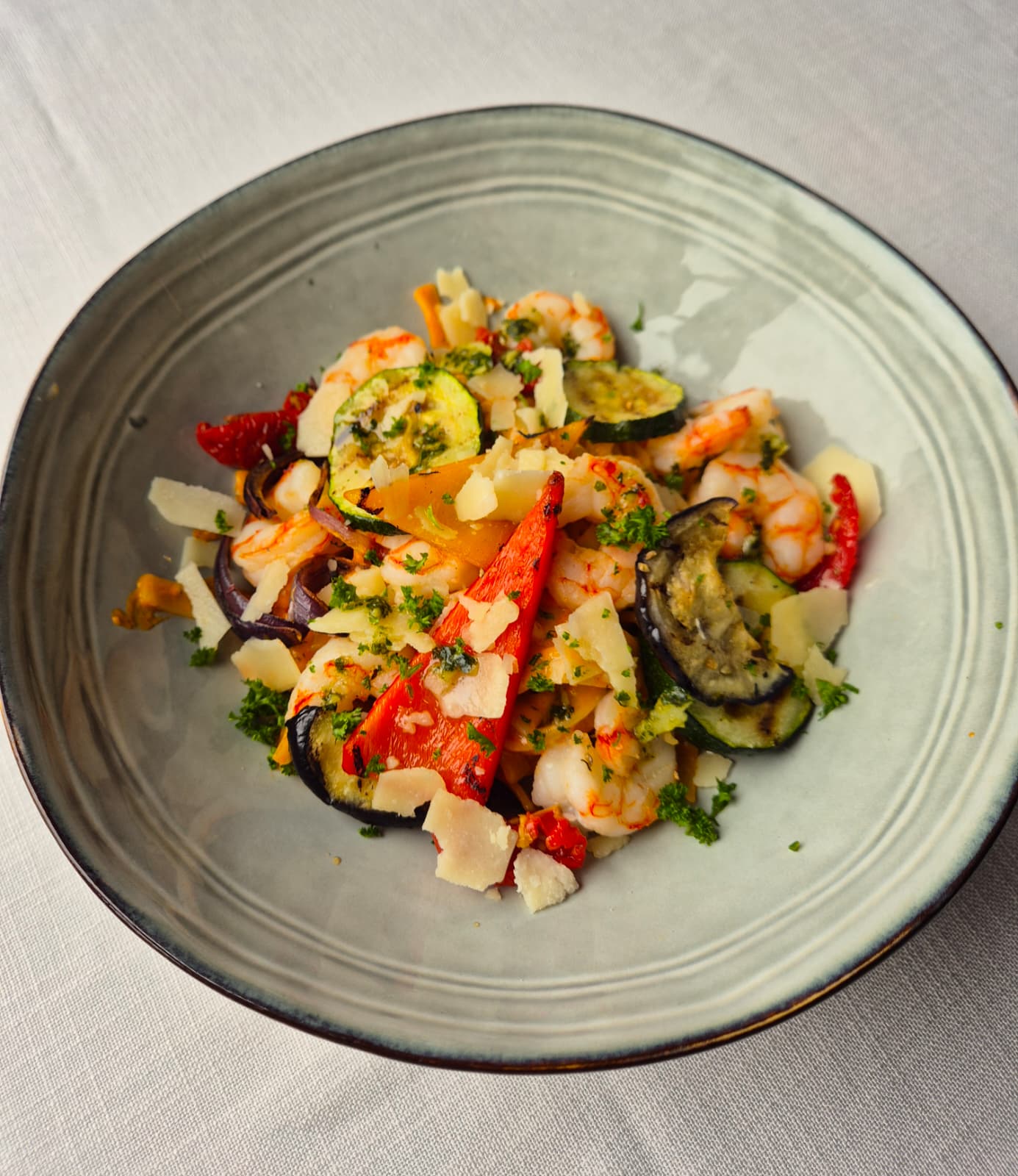 Tagliatelle met rode pestosaus, garnalen, gegrilde groenten, zongedroogd tomaat, rucola en Parmezaanse kaas.