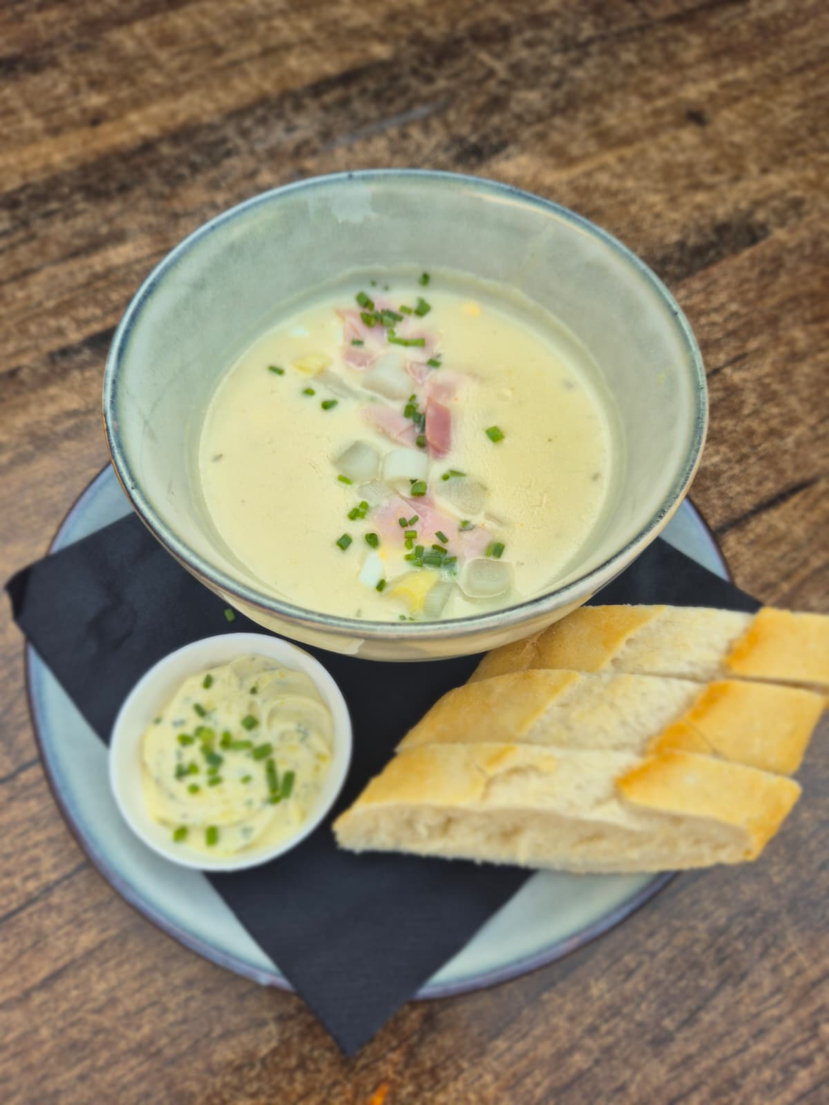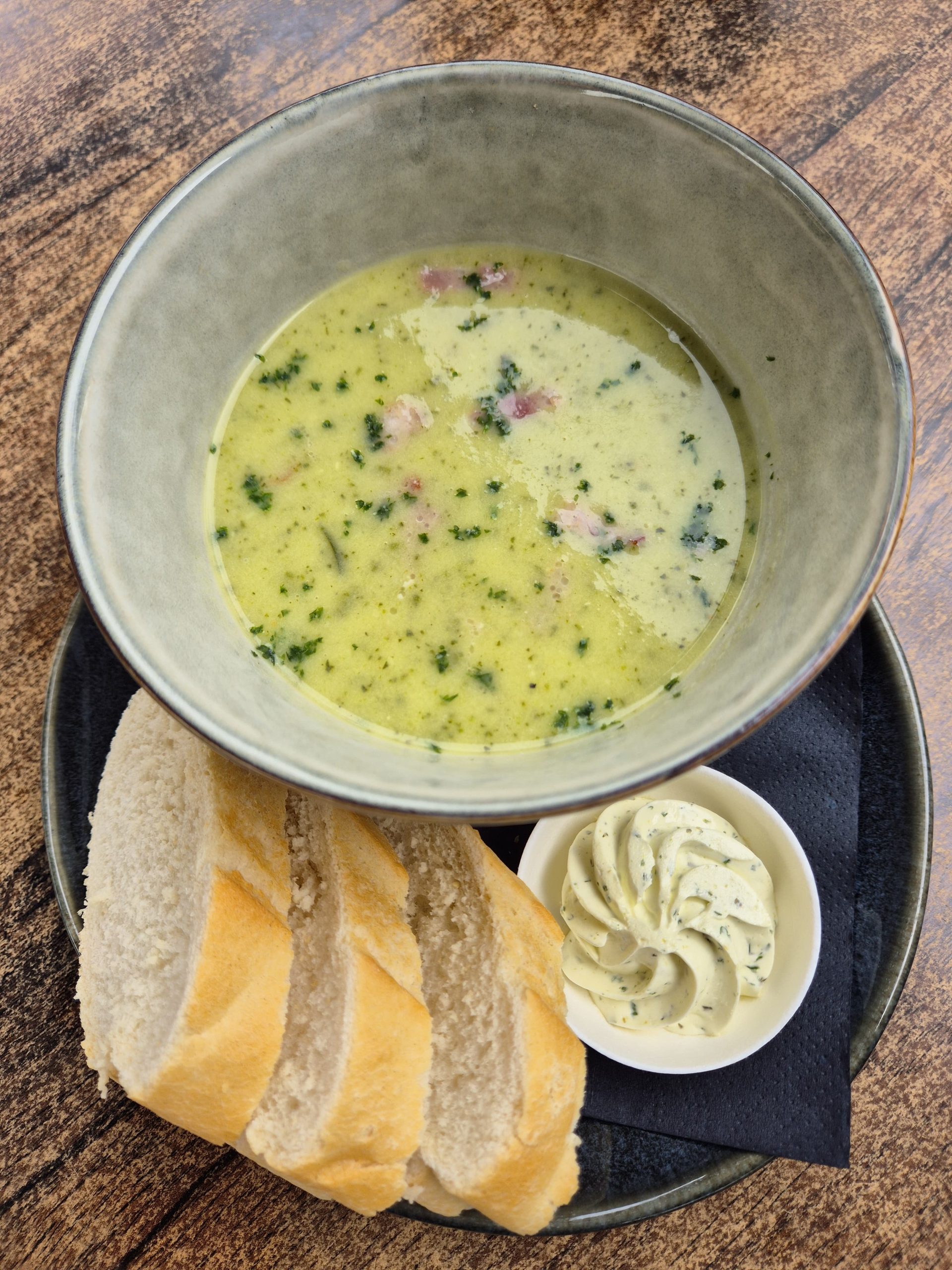 Brocolli soep met creme frâiche en spekjes.