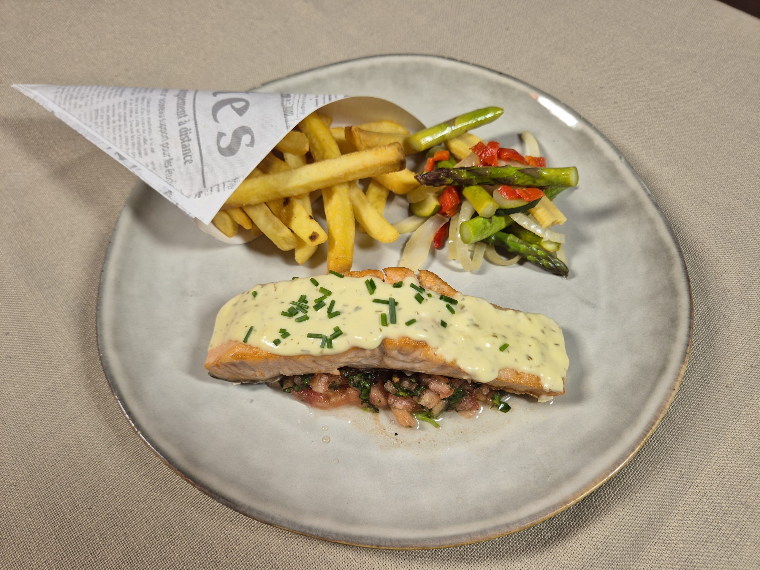 Op de huid gebakken zalm met citroendille roomsaus, tomatenbruchetta, seizoensgroenten en friet.